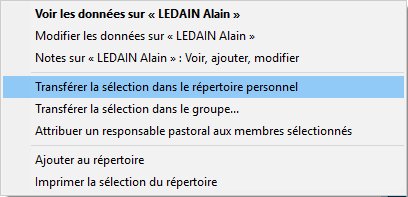 Pour se faire, alors que le répertoire de l'église est affiché, ils doivent sélectionner les membres à inclure dans leur répertoire personnel et cliquer avec le bouton droit de la souris pour faire apparaître un menu contextuel :