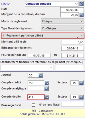 La partie de droite permet la saisie des données relatives au don ou à la cotisation : son libellé, son montant, les références du règlement (banque...), les comptes utilisés au débit et au crédit, le journal comptable...