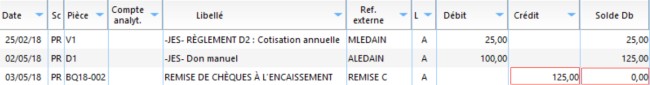 Lors de son paiement, les deux écritures - l'une correspondant à la cotisation, l'autre à son paiement - sont générées et le compte 411 est lettré et soldé (si le paiement de la cotisation est intégral).